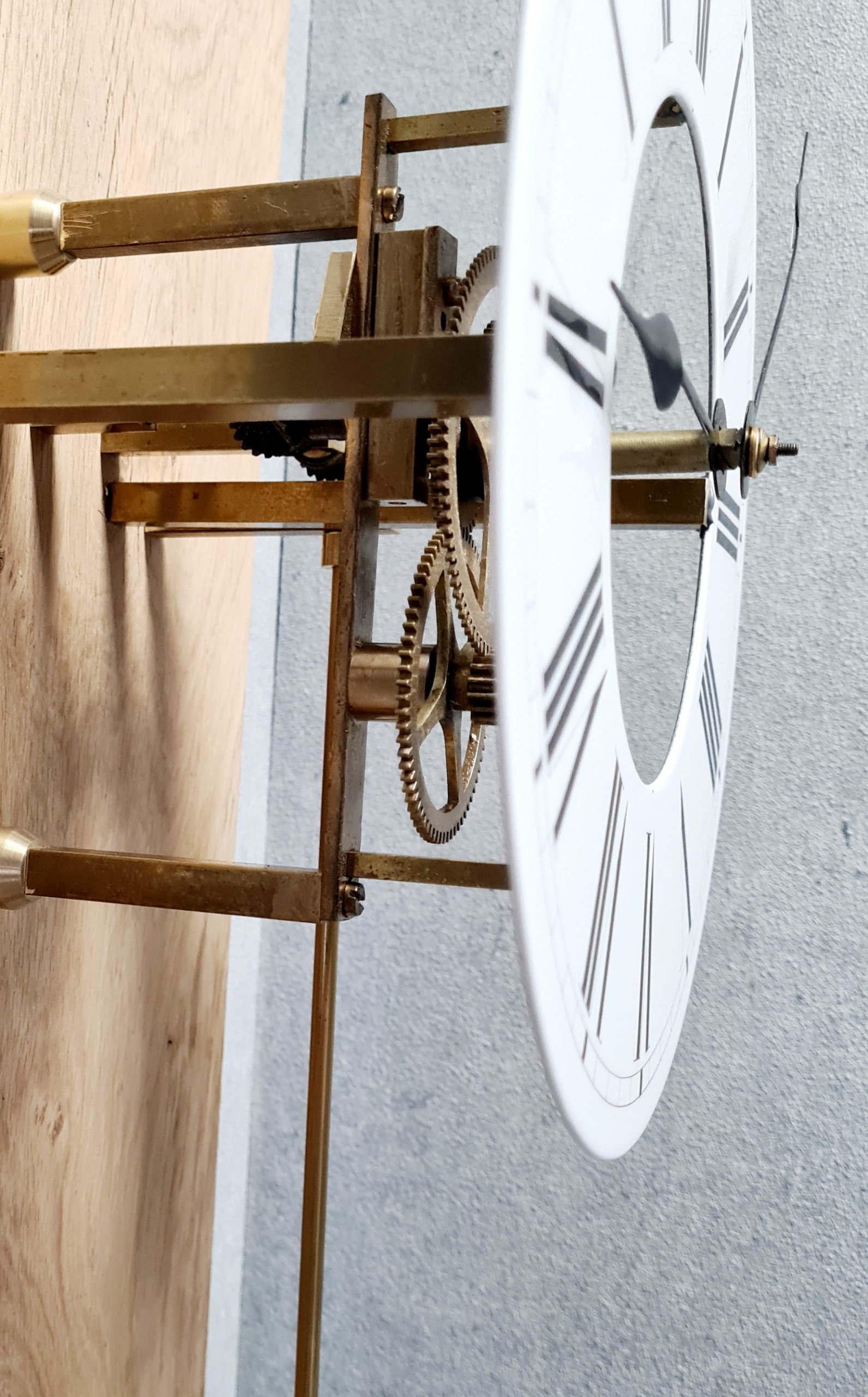 Deze van oorsprong muurgevel klok, is nu op een eikenhouten paneel geplaatst, waar het gewicht ongeveer een val van een meter heeft.